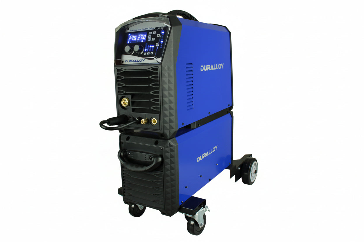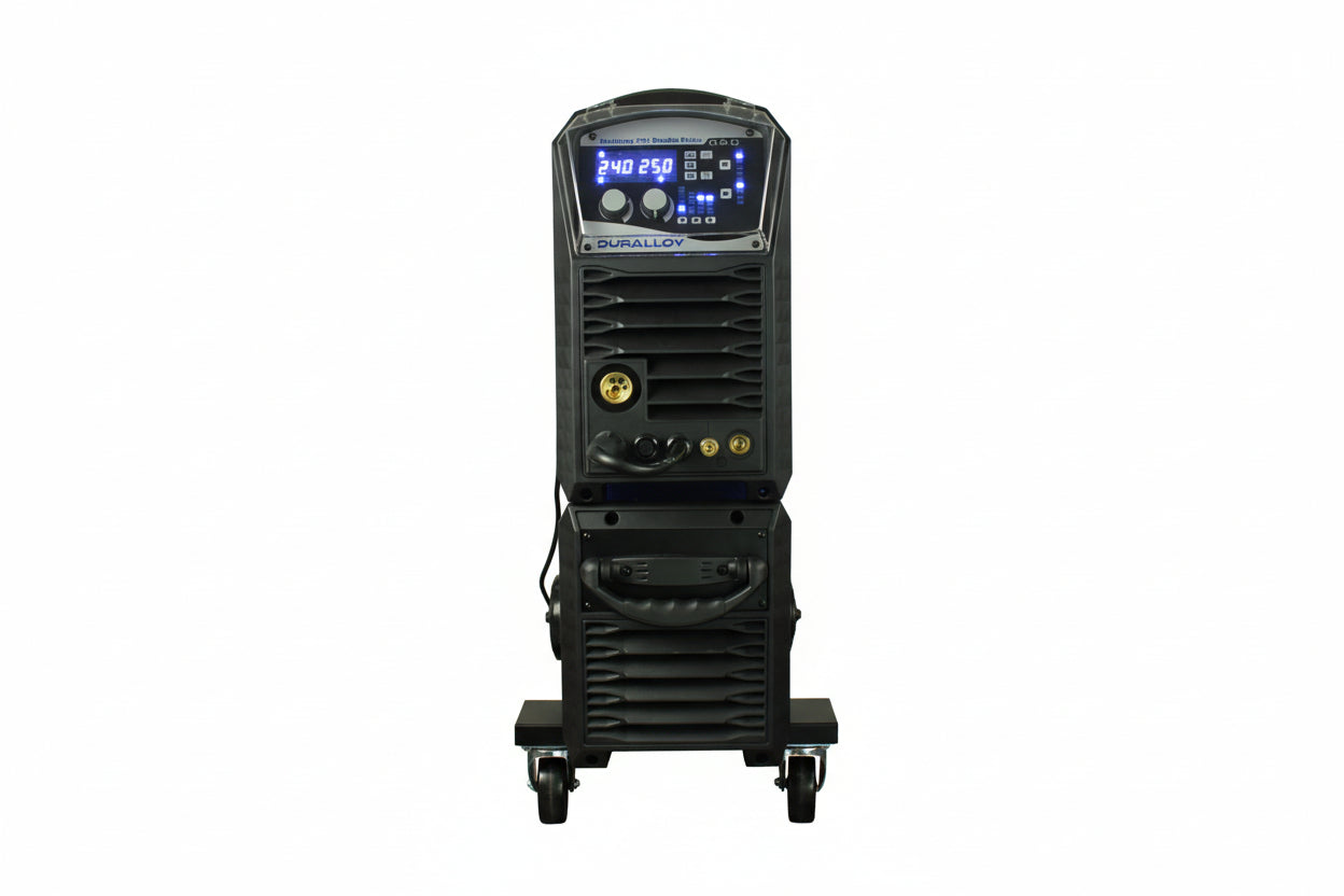 Duralloy® MultiMIG 251 Inverter Double Pulse MIG 240V is a high-output multi-process machine designed for fabrication work where weld appearance, arc control and repeatability are important. Running on a 240 V 15 A supply, it combines standard MIG, pulse MIG and double-pulse MIG with MMA and lift TIG capability in a single inverter platform.